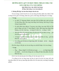 01 Bộ sản phẩm VĂN BẢN THOẢ THUẬN CHIA TÀI SẢN CHUNG CỦA VỢ CHỒNG kèm HƯỚNG DẪN LẬP THOẢ THUẬN CHIA TÀI SẢN CHUNG gồm: