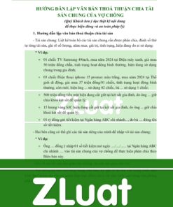 • 01 Hướng dẫn lập thoả thuận chia tài sản chung do các Luật sư dày dạn kinh nghiệm của Zluat nghiên cứu soạn thảo, dựa trên hiểu biết pháp luật và kinh nghiệm thực tế giải quyết tranh chấp Hôn nhân Gia đình trong nhiều năm.