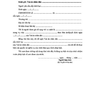 – Ghi tư cách tham gia tố tụng của người yêu cầu trích lục (ví dụ: Nguyên đơn, bị đơn, người có quyền lợi và nghĩa vụ liên quan, bị hại,…)
