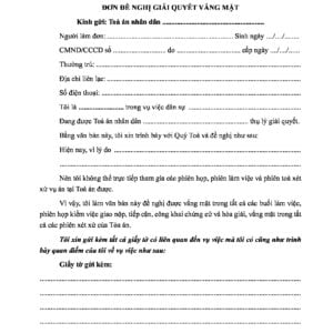 Để tiết kiệm công sức, thời gian đi lại cho Quý Khách hàng, Luật sư Zluat cung cấp mẫu chuẩn ĐƠN ĐỀ NGHỊ TOÀ ÁN GIẢI QUYẾT VẮNG MẶT (vắng mặt tất cả các phiên làm việc, phiên họp, phiên hoà giải, phiên xét xử). Trong đơn Quý Khách hàng có thể trình bày cụ thể các yêu cầu giải quyết vụ việc.
