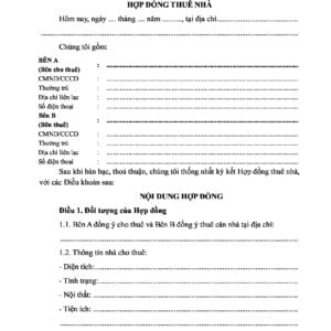 Để đáp ứng nhu cầu cho Quý Khách, Công ty Luật Việt Nam (Zluat) cung cấp Mẫu HỢP ĐỒNG THUÊ NHÀ – CHO THUÊ NHÀ chuẩn pháp lý do Luật sư soạn thảo, bảo đảm chi tiết, dễ ký kết và thực hiện.