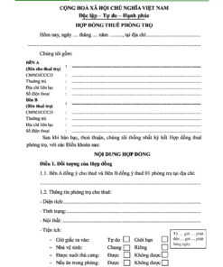 Để đáp ứng nhu cầu cho Quý Khách, Công ty Luật Việt Nam (Zluat) cung cấp Mẫu chuẩn HỢP ĐỒNG THUÊ – CHO THUÊ PHÒNG TRỌ chuẩn pháp lý do Luật sư soạn thảo, bảo đảm chi tiết, dễ ký kết và thực hiện.